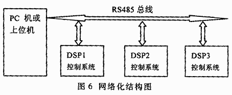 通过网络控制无刷直流电动机的运行可以说是该控制系统的一个特色。通常是无刷直流电动机的控制系统都是单机控制或采用双控制器进行控制,很少通过网络来控制。本控制系统采用RS485通讯接口进行网络化数据传输。主要的网络传输示意图如图6所示。上位机或PC机为每个控制模块软件分配地址,发送数据给每个模块,而主机在发送数据时主要是通过分配给每个模块的地址识别发送对象。网络系统上电后,在进行网络初始化之前,除了主机的组地址和地址可以确定外,所有驱动器模块组地址和地址都是0xFF,表示该驱动器模块只在0xFF这个全体组内,且地址没有初始化。由硬件的连接方式决定,此时网络的下一个驱动器模块处于等待网络初始化指令状态,主机应当发送一个地址分配指令对该驱动器模块进行地址分配。一旦该驱动器模块地址分配成功,它便通过硬件向下一个驱动器模块传递信息,表示自身已经分配完毕。然后主机的下一个地址分配指令将作用于下一个驱动器模块。这个过程将一直持续下去,直到主机在发送地址分配指令后收到分配成功的反馈信息为止,此时表示没有需要分配的驱动器模块了。至此网络初始化完毕。在网络已经建立好的情况下,主机可以通过发送网络复位指令,使所有驱动器模块复位为刚上电的状态,然后再次进行初始化,即提供了网络“热”重建能力。